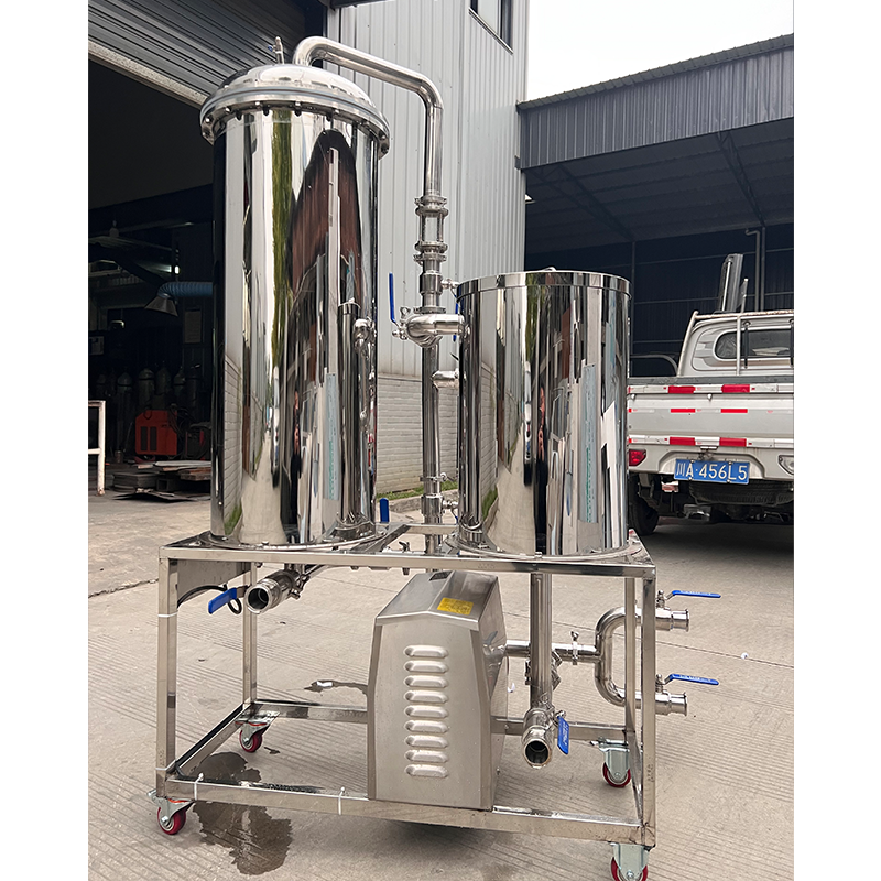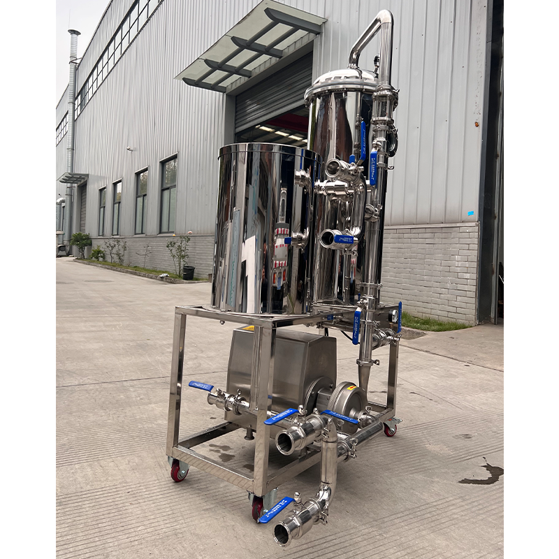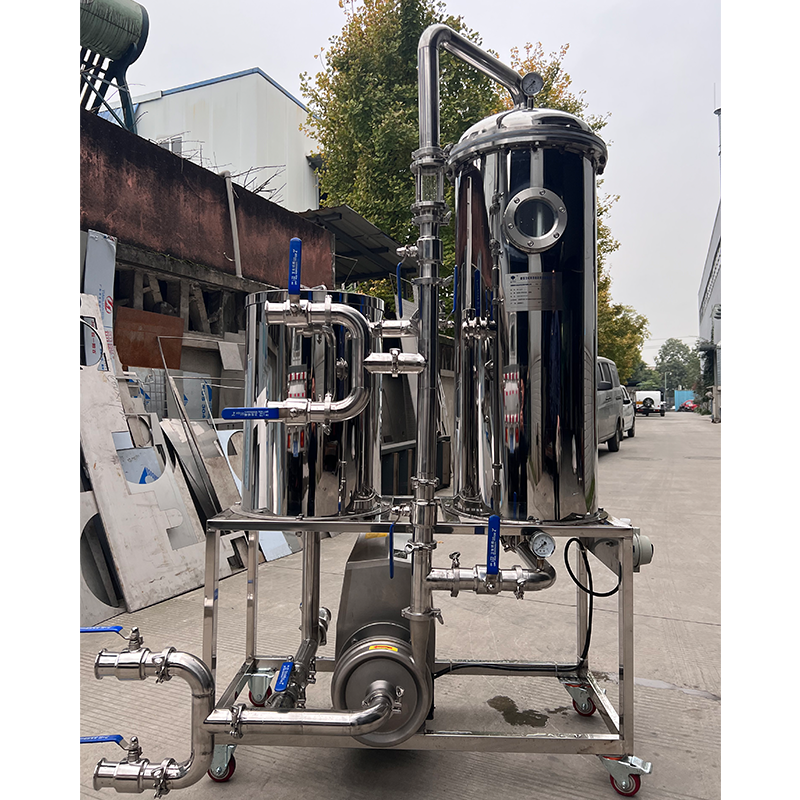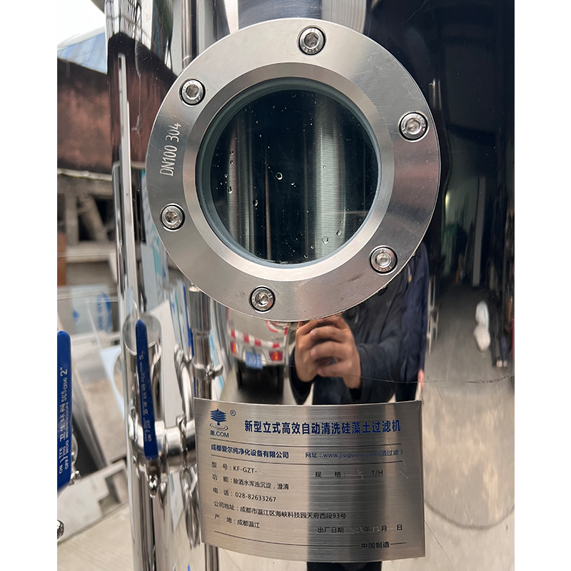 該新型立式高效自動清洗硅藻土過濾機,通過設備自帶預處理罐,一次加入少量食品級硅藻土助濾劑,及需要過濾的酒液或其他液體攪拌自動循環(huán)。將硅藻土助濾劑填充到304不銹鋼濾芯表面,形成精濾預涂層膜,該精濾膜精度可達到0.2微米左右,過濾澄清度高,運行中硅藻土涂層穩(wěn)固,不會出現(xiàn)涂層裂紋,漏土等因素影響過濾效率。正常過濾時精度非常高,過濾后,白酒、保健酒、葡萄酒、果酒、果汁、藥液、澄清透明度達到100%清澈透明,設備濾芯不易堵塞,易于反沖清洗。整個設備清洗時間不超過3分鐘,無需拆卸設備濾芯清洗,直接反沖即可達到排渣,完成清洗工序。設備方便維護,設備因整機及濾芯全部采用304不銹鋼制成,使用壽命長達10年以上,還可根據(jù)不同液體特性及粘稠度,調(diào)整更換濾芯精度,可達到果汁,保健酒,中藥材,脫渣,及精濾澄清功效。